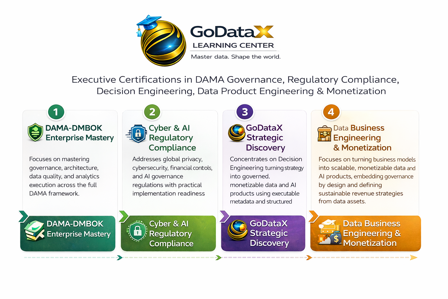 Yes. The programs are complementary. DAMA-DMBOK Enterprise Mastery builds the governance and architecture foundation, Cyber & AI Regulatory Compliance ensures regulatory alignment and risk reduction, GoDataX Strategic Discovery activates value creation through decision engineering, and Data Business Engineering & Monetization transforms strategy into scalable, monetizable data and AI products.